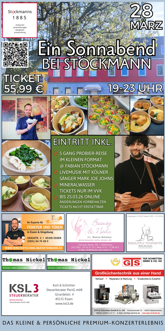 Am Samstag den 28. März (19-23 Uhr) heißt es wieder „Ein Sonnabend bei Stöckmann“ – unsere beliebte Veranstaltungsreihe im Herzen von Essen-Frintrop.